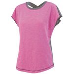 100% polyester heathered wicking knit * Cationic dye used to create heathered look reduces chance of dye migration * Wicks moisture away from the body * Ladies' fit * Pad print label * Self-fabric crew neck collar * Contrast color raglan sleeves * Double-needle hemmed bottoms and sleeve.