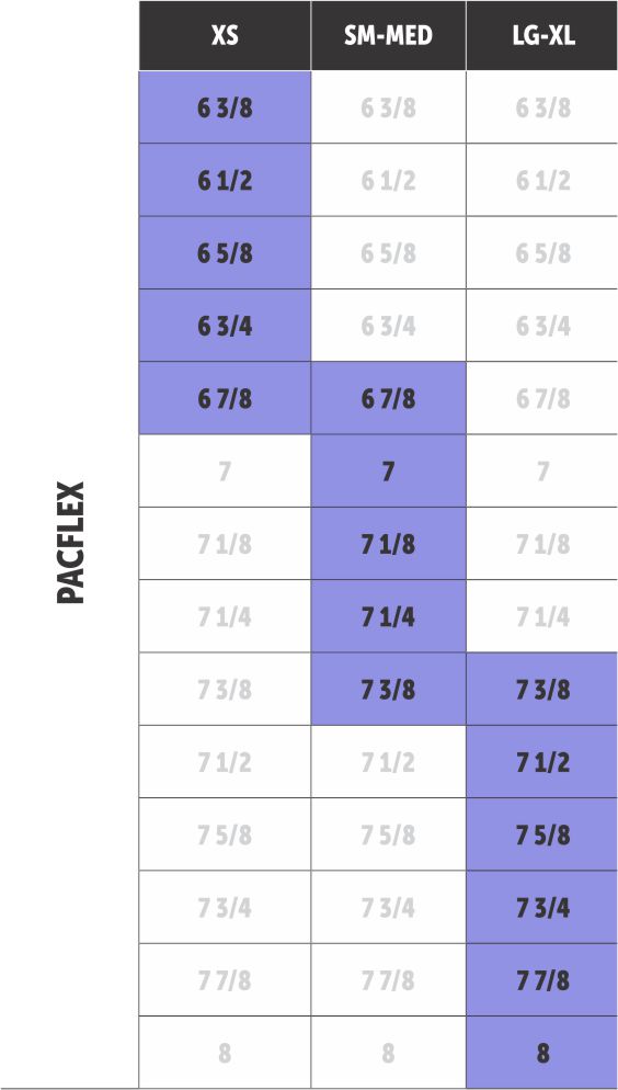 | Hip | 34-36 | 37-38 | 39-40 | 41-43 | 44-46 | 47-49 | 50-53 | 54-57 |